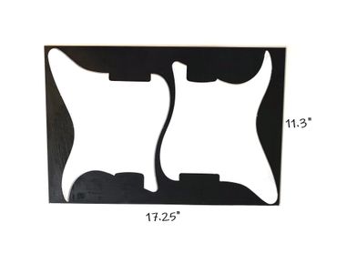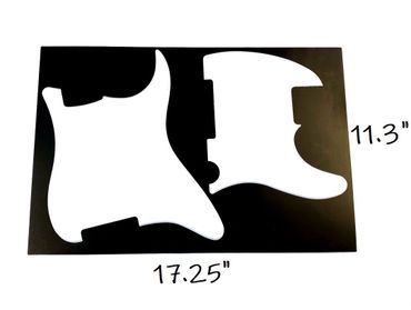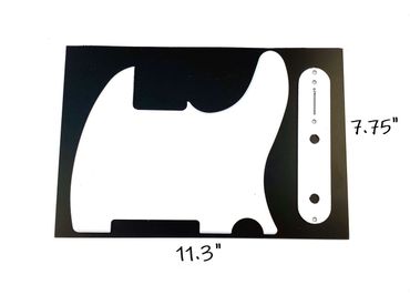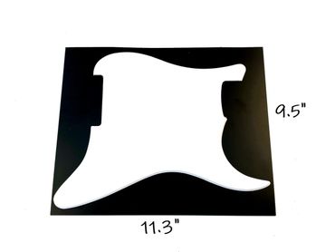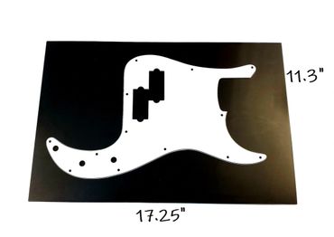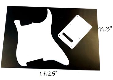 We offer pickguard material sheets so you can create your own unique design or customize a pickguard, scratchplate, trem cover, backplate, jazz or tele plate, or any other suitable project. Check the images below see some examples of size options available, spacing possibilities and sample projects. Material sheets come in a huge variety of styles and colors and sample pieces are available if you want to check out a small piece before buying a larger sheet.